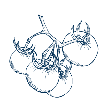 Há algo surpreendente nas folhas do tomate, e o tomate em si. Tem uma geometria cativante quando você para para olhá-lo. Os frutos em diferentes estágios de maturação criam uma progressão de cor natural — do verde fechado ao vermelho-coral maduro. As folhas têm um recorte quase ornamental. O caule, com seus pelos finos e suas ramificações, carrega uma estrutura botânica que funciona muito bem como elemento de conexão num rapport. E o elemento que não aparece no desenho, mas carrego comigo, o aroma delicioso das folhas do tomateiro, um perfume de frescor, leve, delicado.