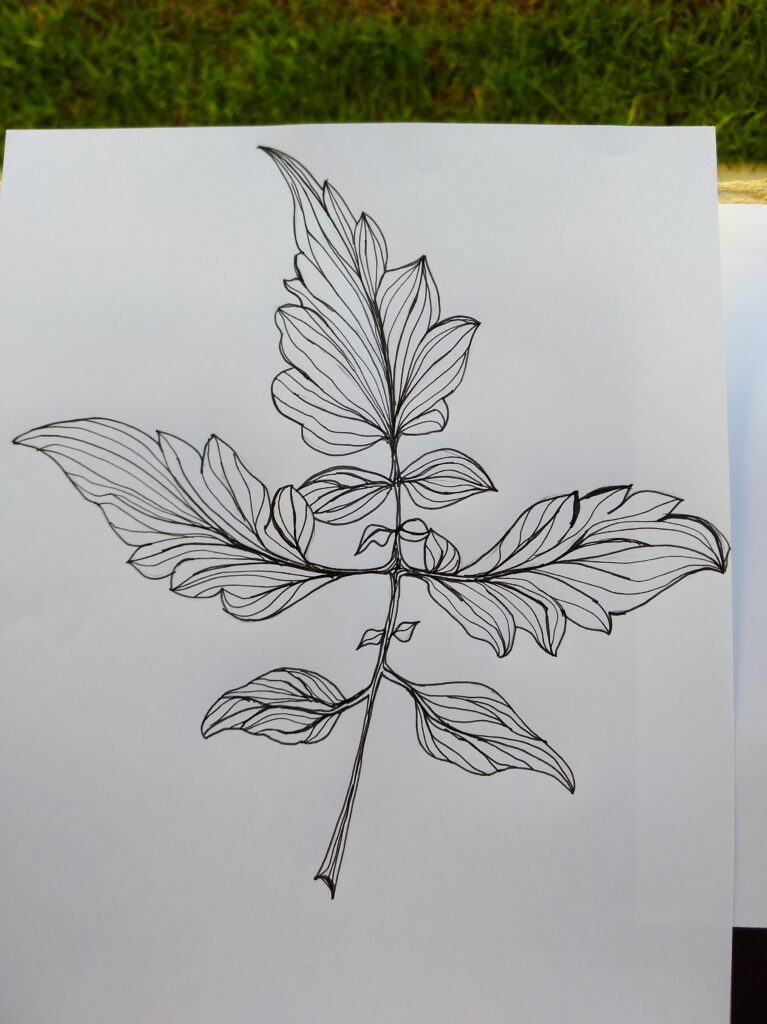 O nanquim vem depois — e é ele que define o caráter de uma coleção MAB. O traço do nanquim tem personalidade: espessa nas formas principais, afina nos terminais, varia com a pressão. Não é o traço uniforme de uma ferramenta digital. É o traço de quem observou a planta e quer que essa observação apareça no resultado final.
