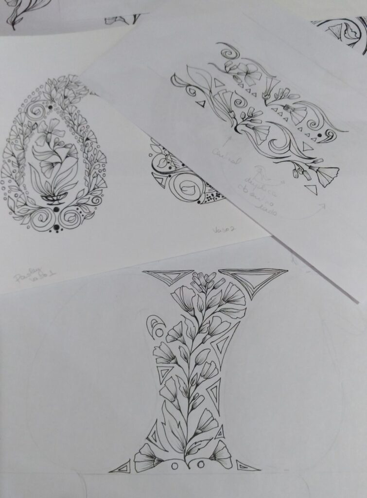A Indian Floral Collection MAB entra nessa história com uma posição clara: não é uma reprodução, é uma reinterpretação. O vocabulário é o mesmo — a forma boteh, os florais ornamentais, a densidade decorativa característica. A origem, porém, é outra: mão brasileira, quintal interiorano, nanquim sobre papel.
