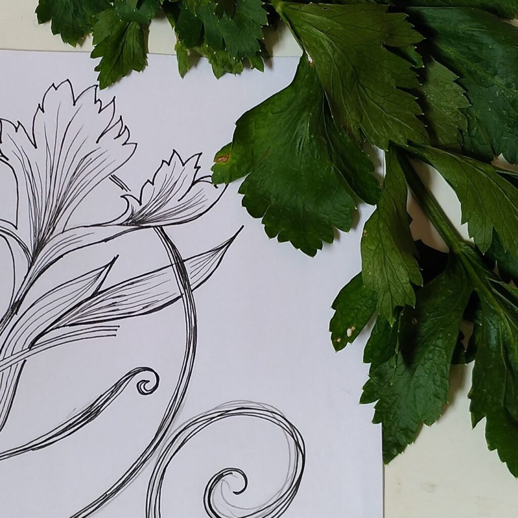 Nessa época eu estava fazendo o curso Repertoire da Bärbel Dressler — designer e historiadora de padrões sueca, que ensina surface pattern design a partir da história das estampas. Preciso confessar: antes mesmo de pegar no lápis, o que me encantava nas aulas era a história. A forma como Bärbel conduzia o contexto de cada estilo — de onde veio, por que surgiu, o que o mercado e a cultura daquele momento pediam — era um deleite genuíno. Aprendi muito, e foi em meio ao módulo de Arts & Crafts que, numa manhã em Bragança Paulista, saí para o quintal olhar a horta — e o salsão estava lá.
